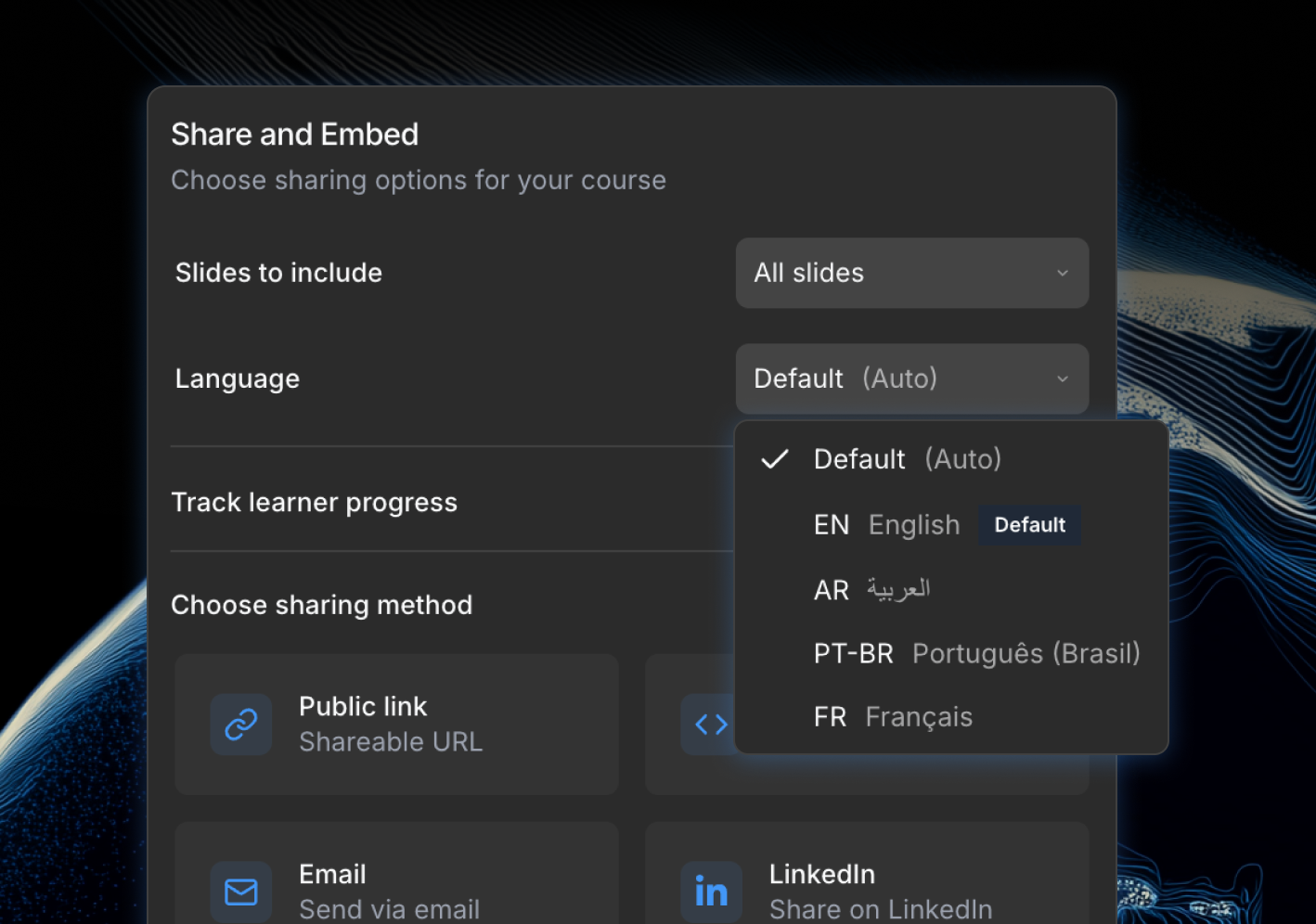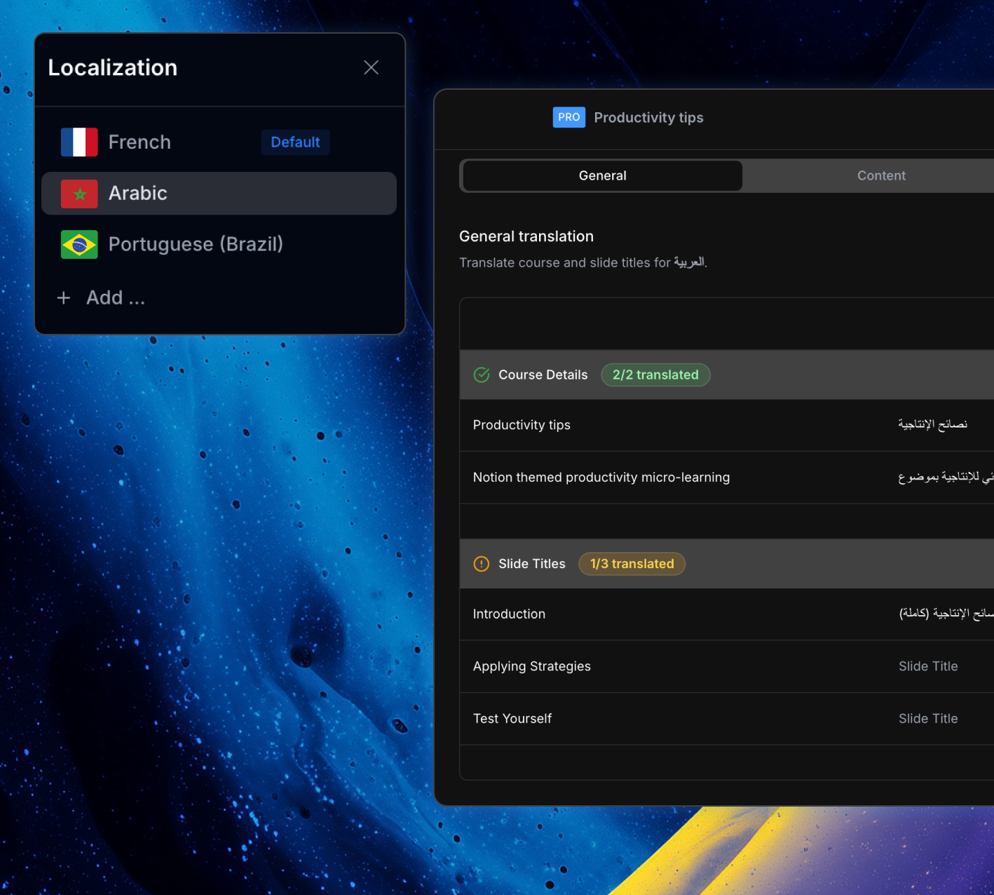 Choisissez quelle langue vous souhaitez exporter—anglais, français, arabe et plus—sans dupliquer le cours.