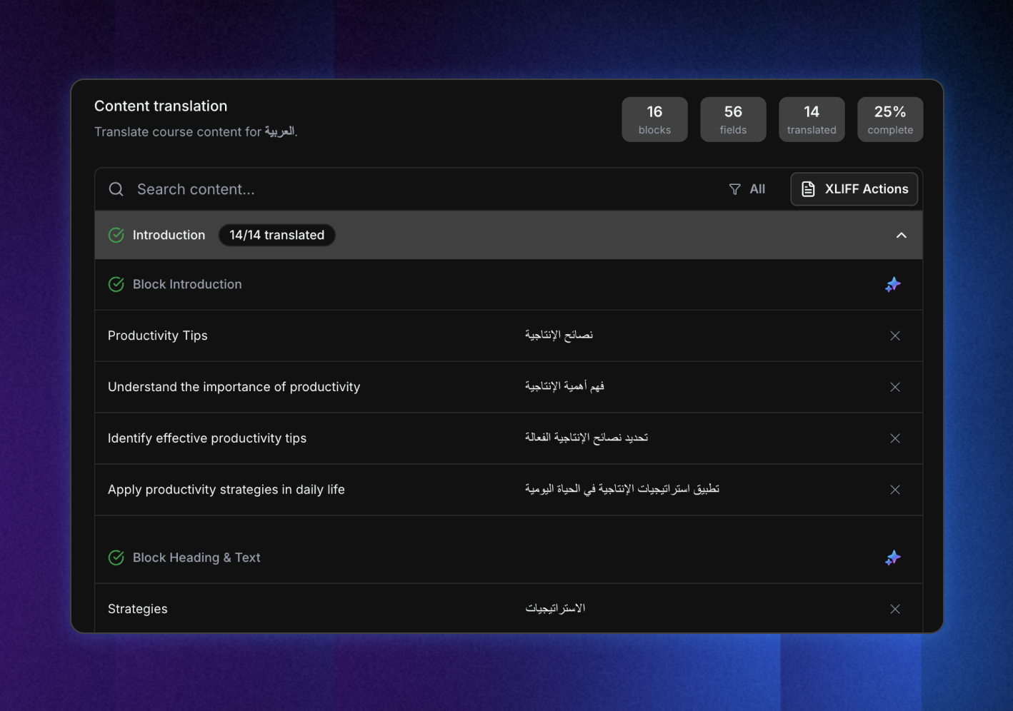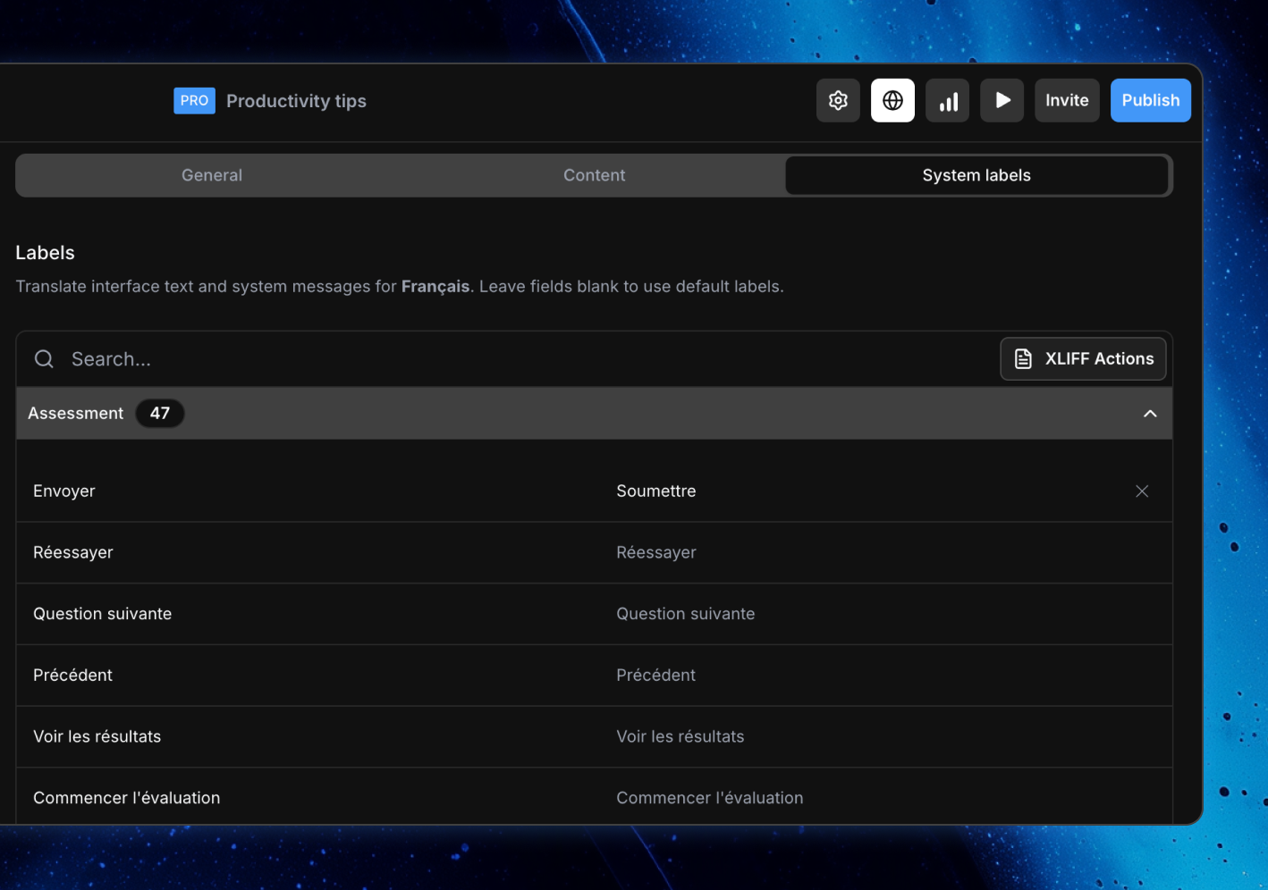 Combinez le panneau de localisation de ScormStack avec des flux basés sur des fichiers (comme l'XLIFF) pour que les agences ou les équipes internes puissent traduire le contenu dans leurs outils préférés.