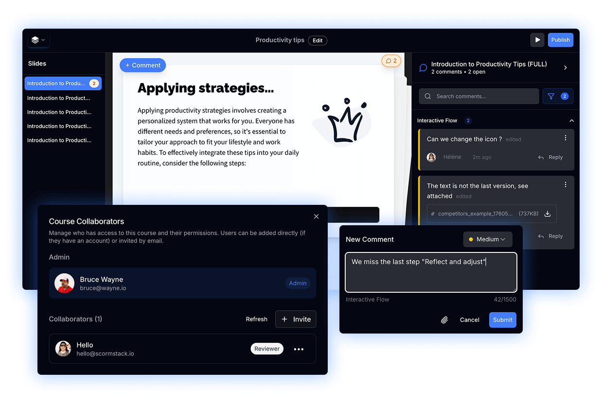 Invitez les membres de l'équipe à travailler ensemble sur les cours. Attribuez des rôles, suivez les modifications et créez un meilleur contenu avec votre équipe.