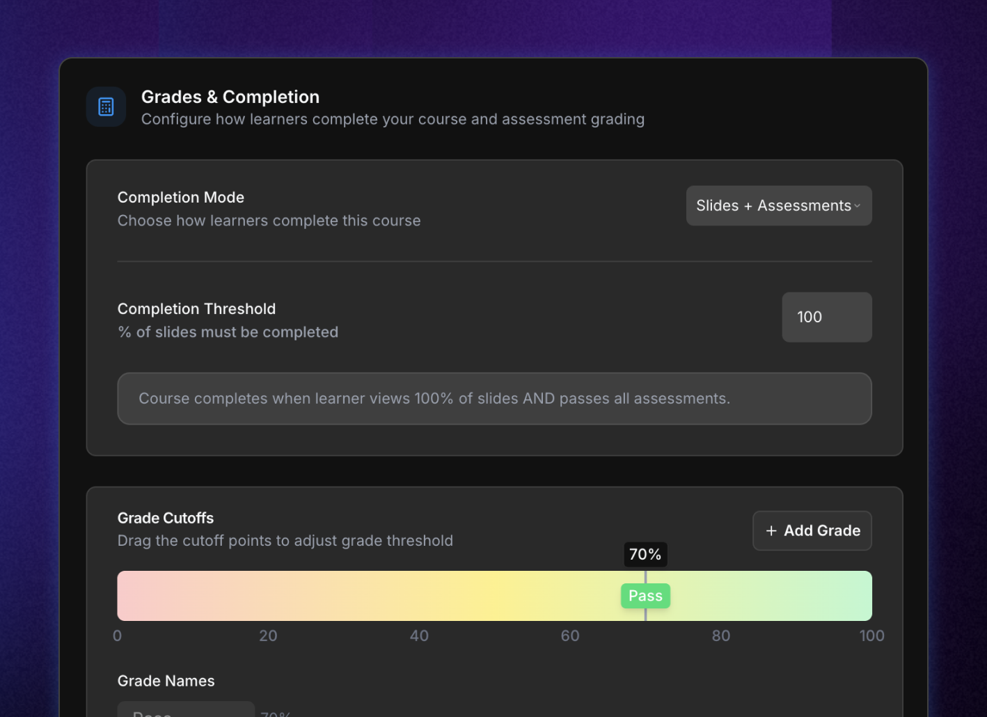 Définissez la complétion en fonction des diapositives vues, des évaluations réussies, ou les deux ensemble.