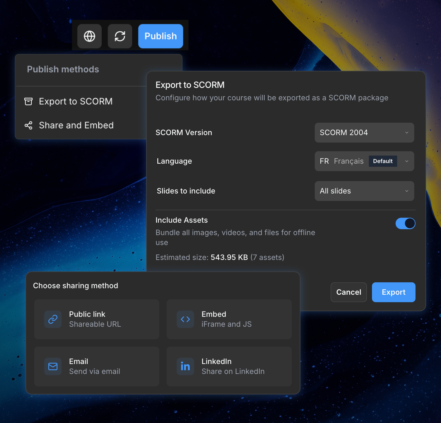 Que vous ayez besoin de SCORM pour votre LMS, de HTML pour votre site web ou d'un lien de partage pour une révision rapide—ScormStack a ce qu'il vous faut.